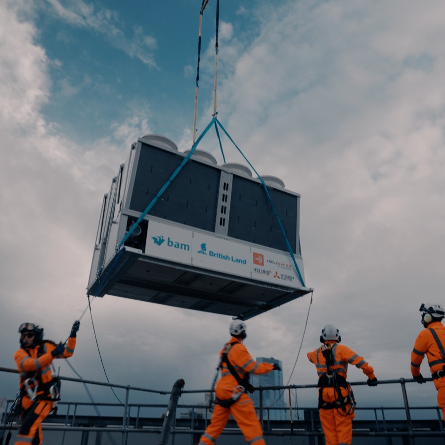 The scope involved installing 15 Mitsubishi Electric air source heat pump (ASHP) units into a 34-storey rooftop plant room at Broadgate Tower, on behalf of British Land – a highly constrained environment with no internal installation route and significant logistical challenges. With conventional methods proving unworkable, the project required a fundamentally different approach – one that could be delivered safely, efficiently, and without compromising programme.